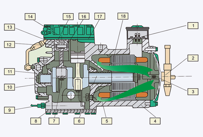 1.接线板 2.吸气阀 3.过滤网 4.机体 5.主轴承 6.曲轴 7.连杆 8.底板盖 9.电加热管 10.后轴承 11.后轴盖 12.均压管 13.活塞销 14.气缸盖 15.活塞 16.活塞环 17.阀板组件 18.电机